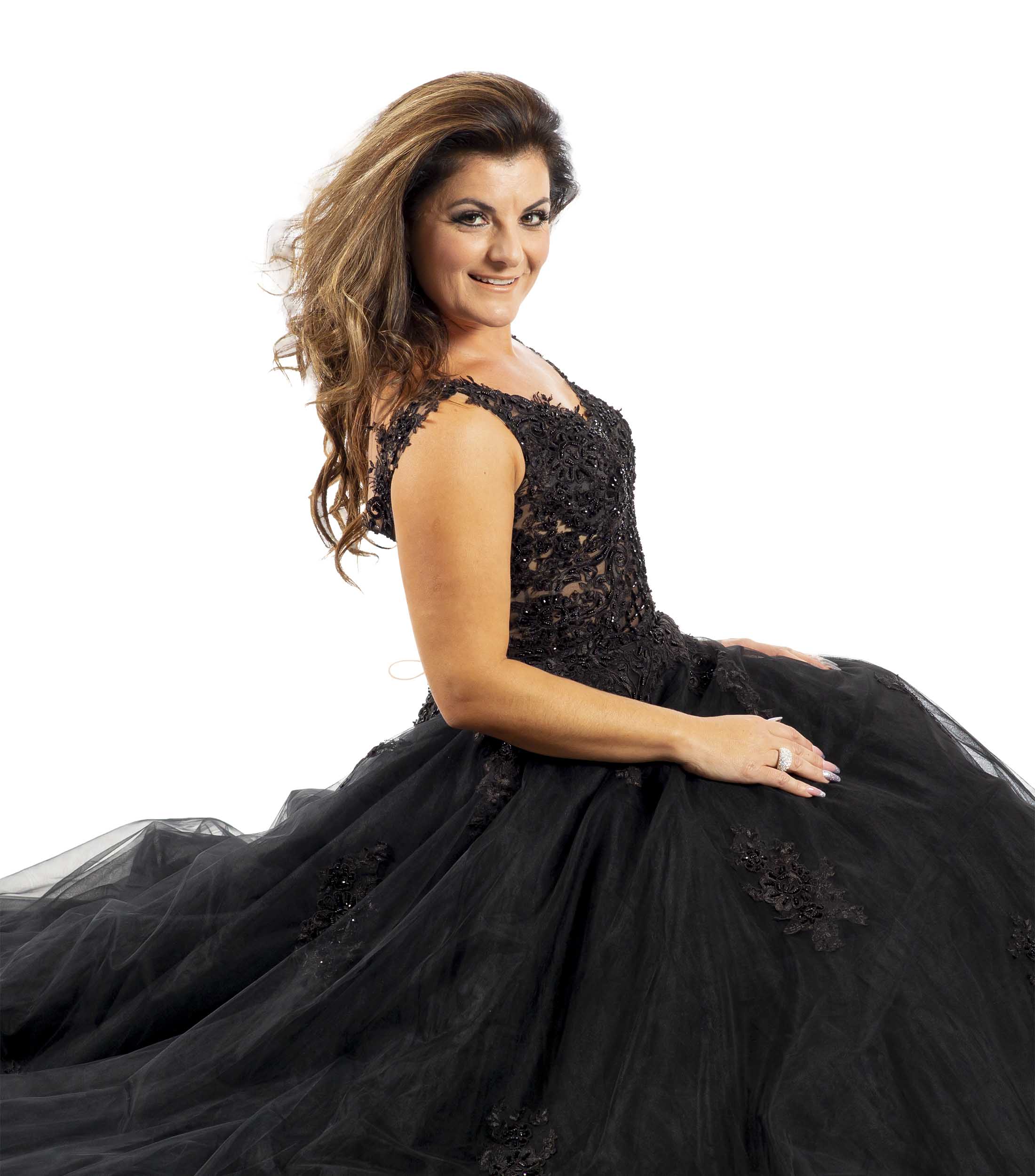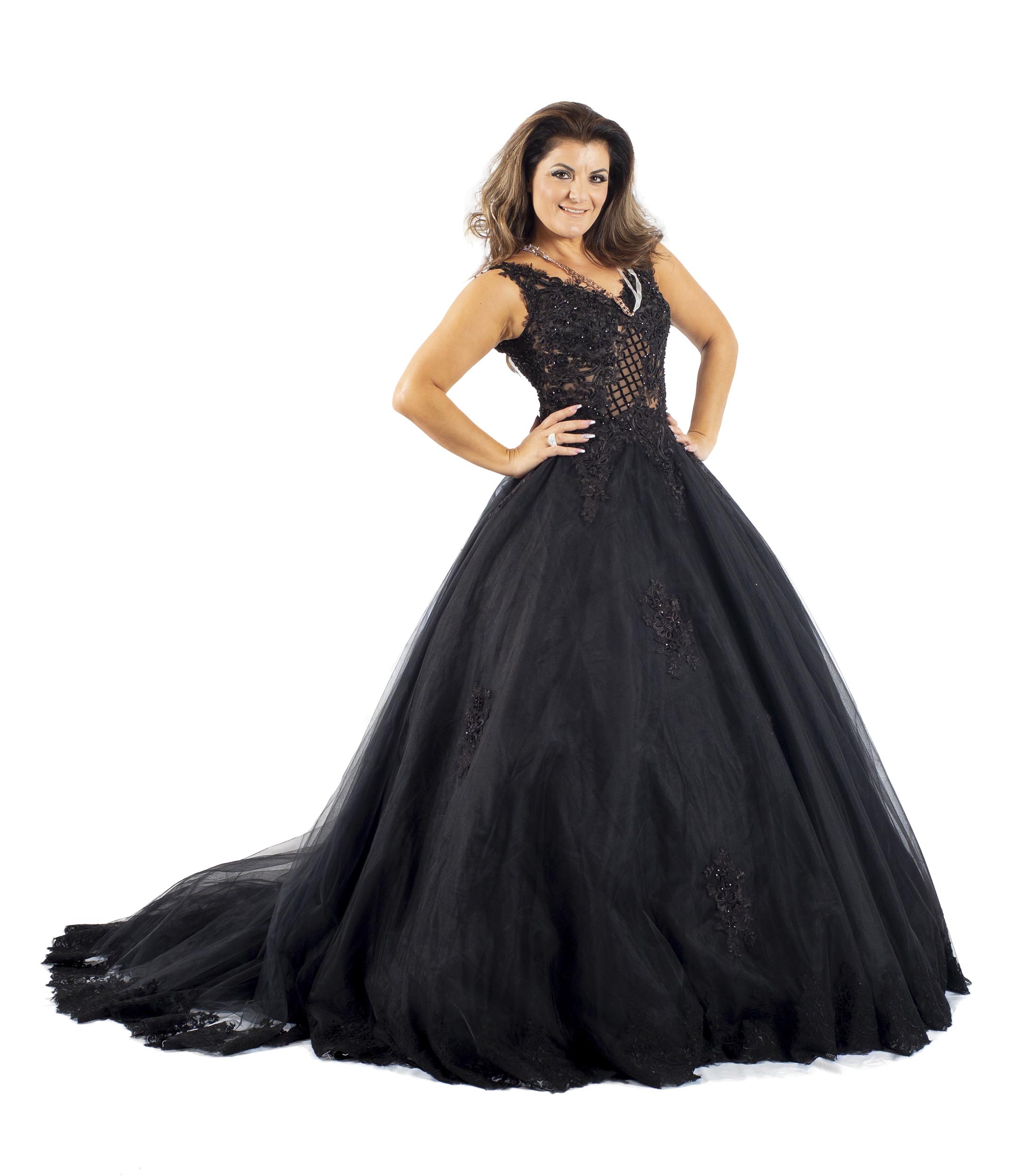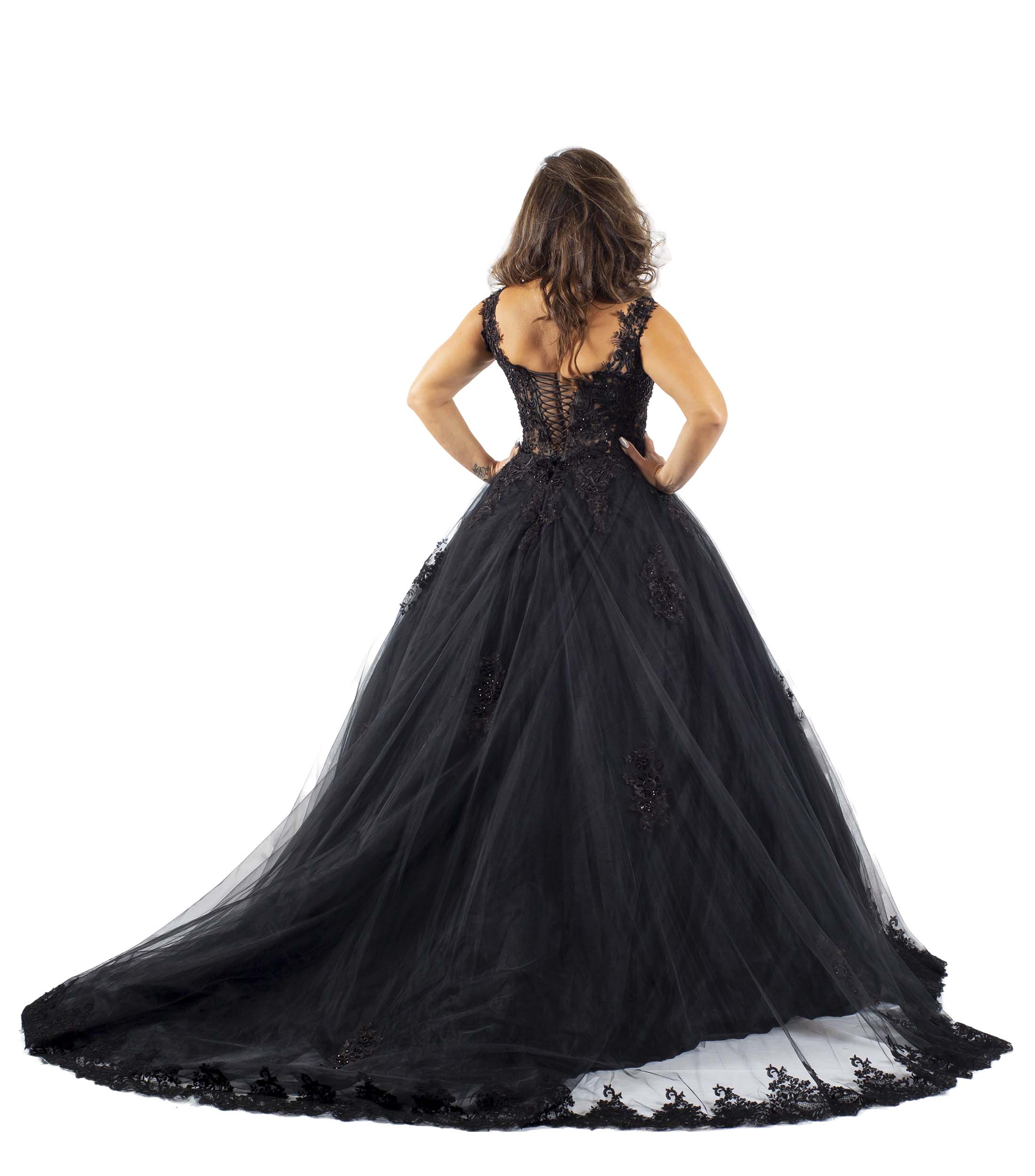 Bei unserem Brautkleid "Katrin" handelt es sich um ein schwarzes A-Linien-Kleid mit transparentem Oberteil mit 3D-Spitze und wundervollen Spitzenträgern.