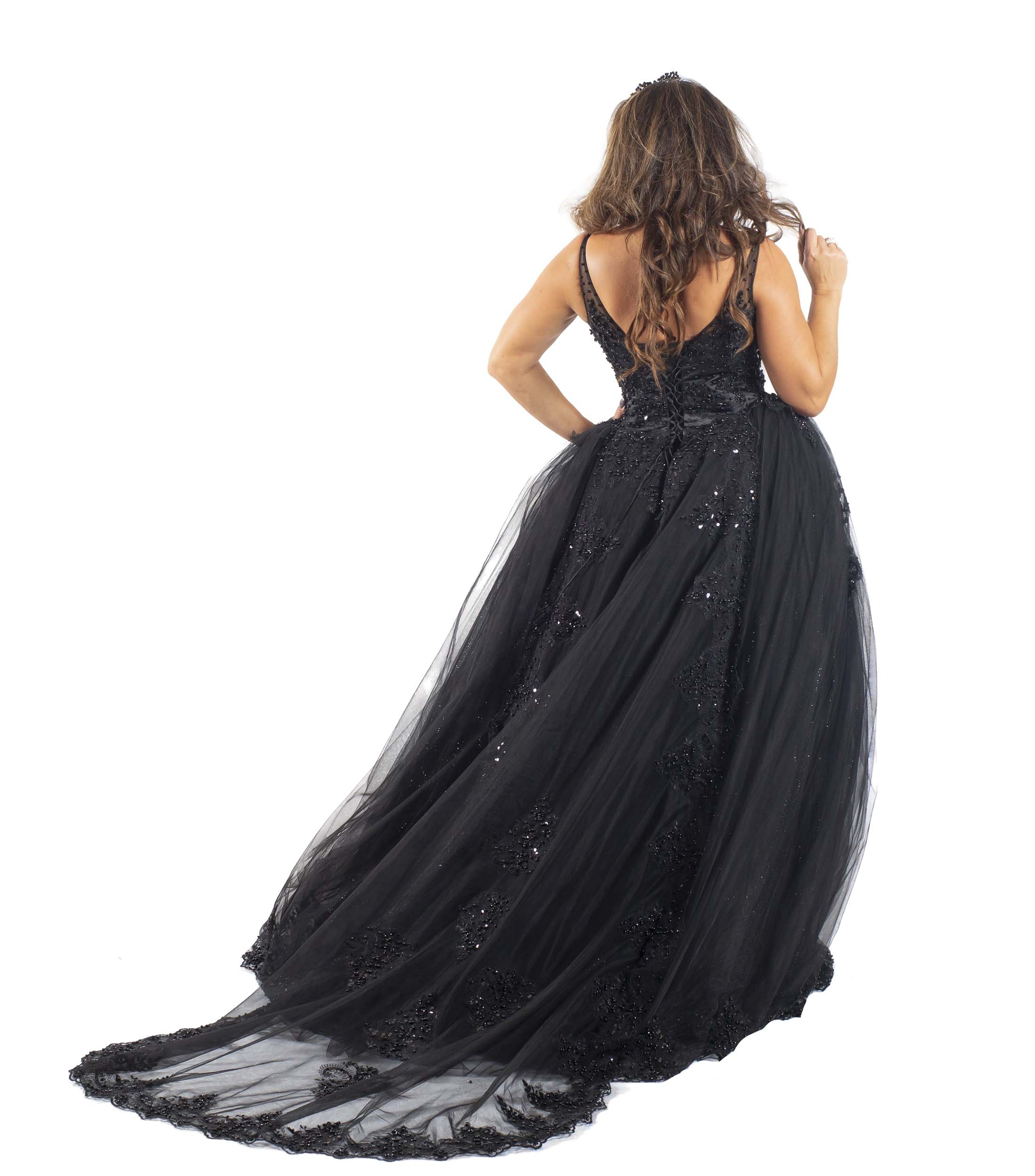 Es besitzt schmale Träger. Der Tüllrock besticht durch sanfte Spitzen-Applikationen und einer hochwertigen Spitzenborte am Saum. Das Rückenteil wird geschnürt, so dass das Brautkleid „Marina“ Ihrer Figur besonders gut schmeichelt.
