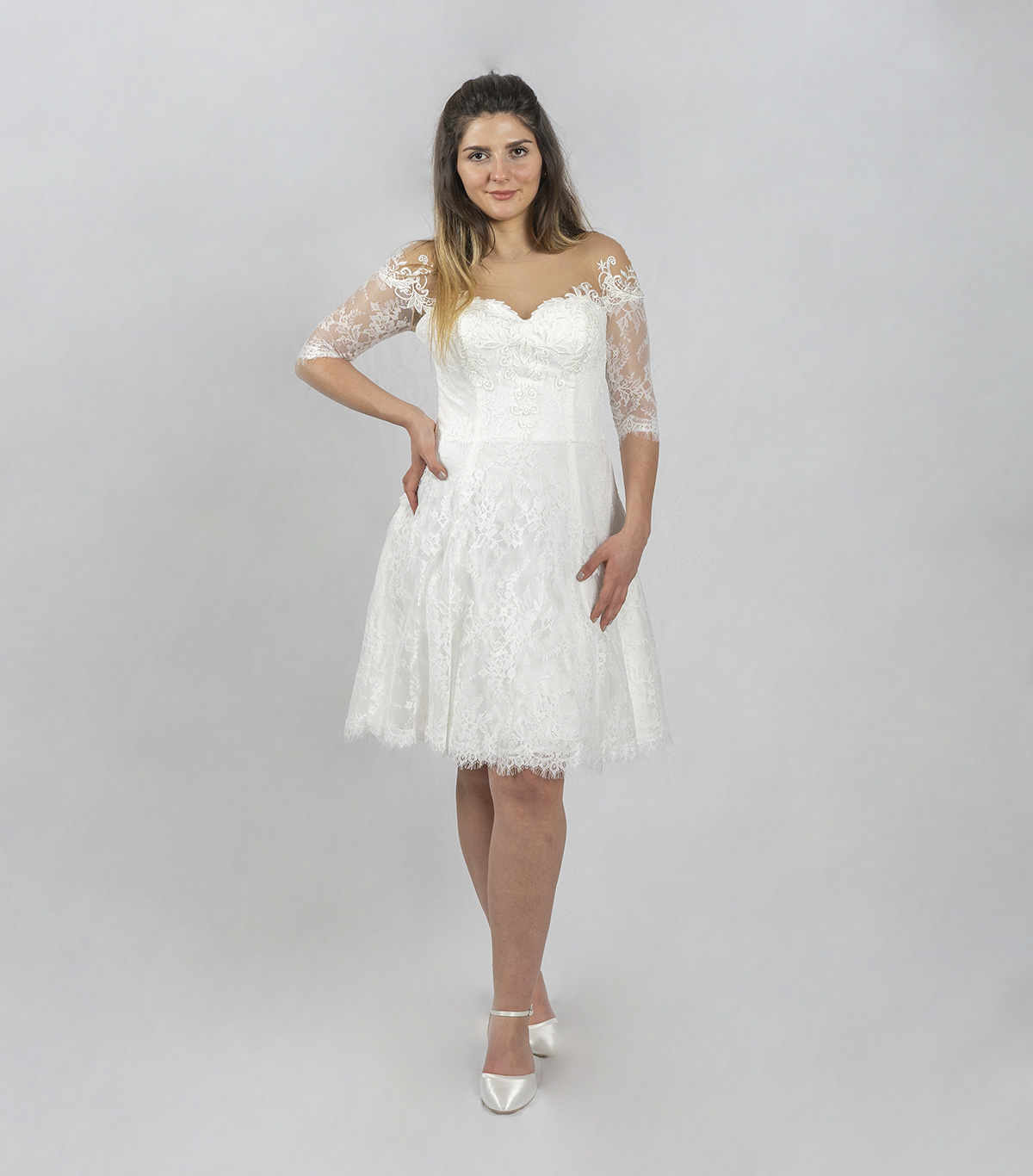 Dieses knielange Kleid ist aus hochwertiger Spitze gefertigt und umschmeichelt mit seiner sanften A-Linie Ihren Körper. Die 3/4 Ärmel sind mit Tattoo Spitze versehen, die Sie auch im Vorder- und Rückenteil wiederfinden. Ein zauberhaftes Kleid für einen zauberhaften Tag.