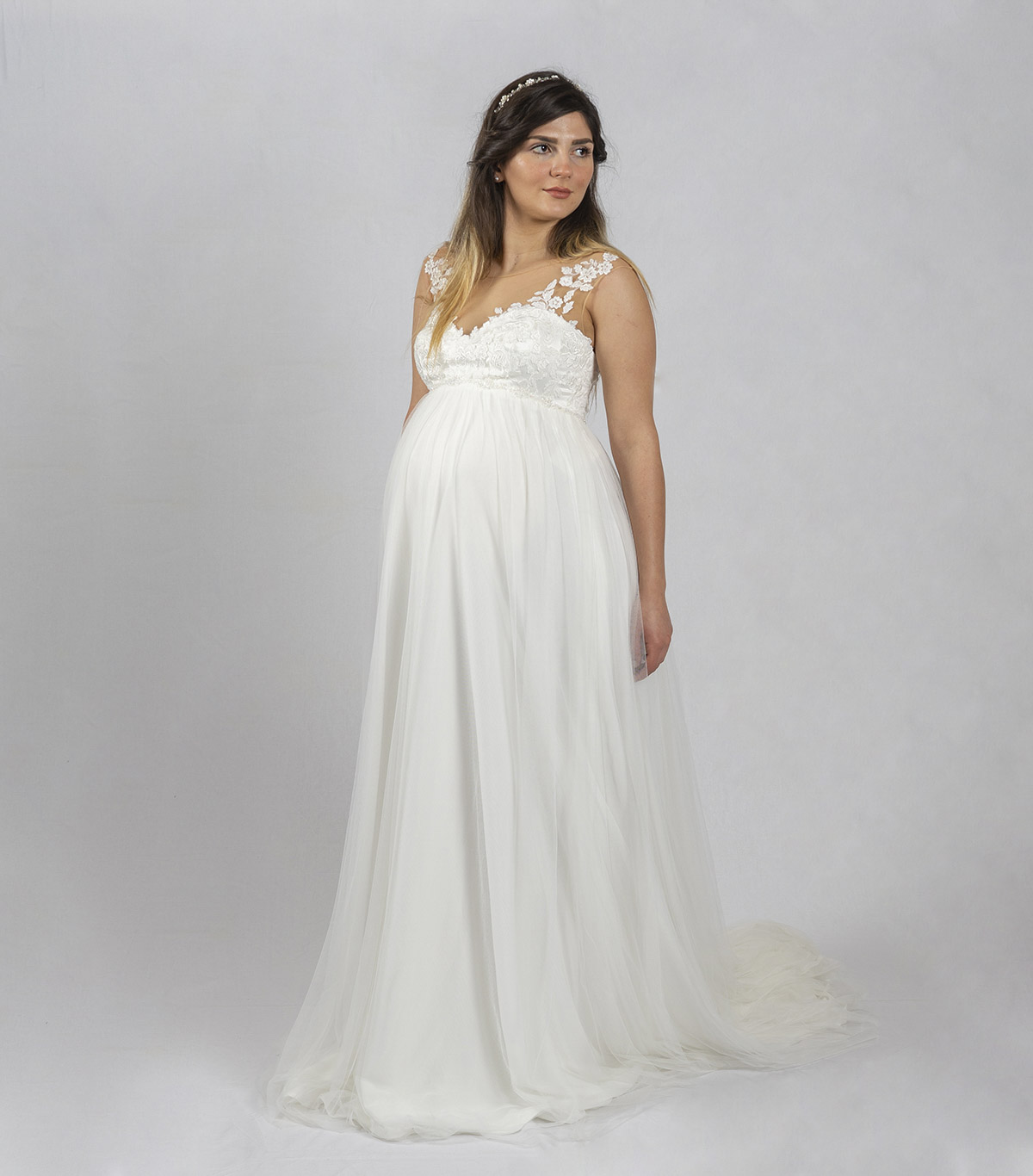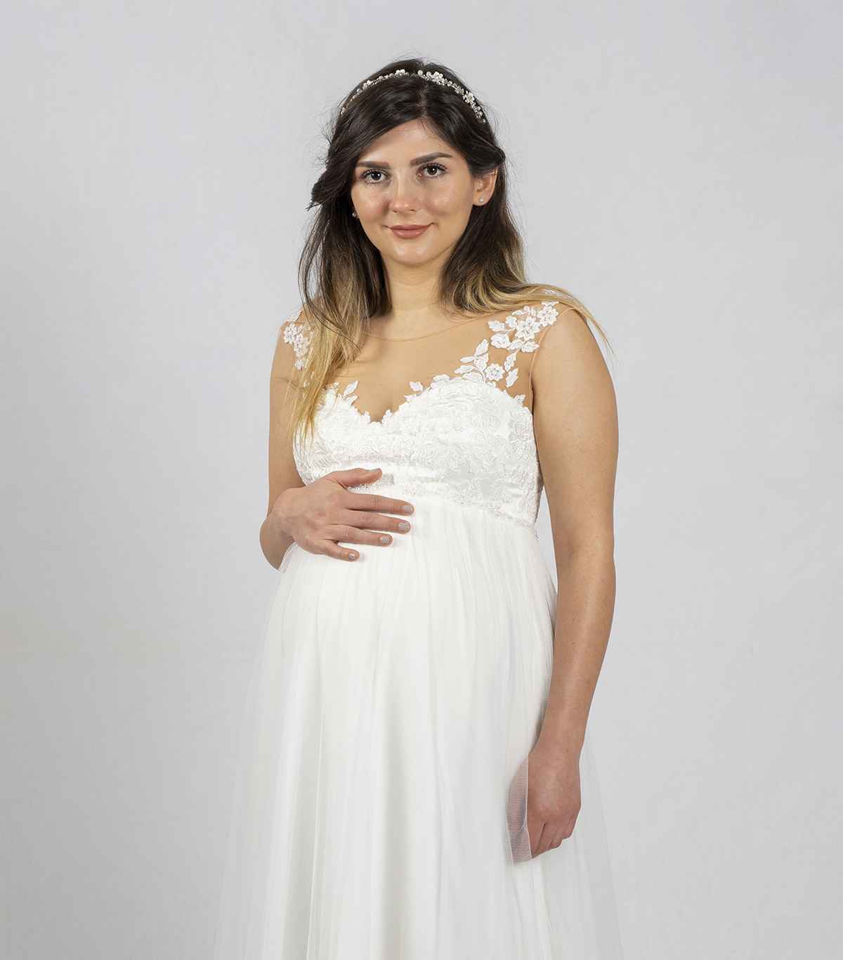 Der Tüll Rock mit Glitzergürtel betont Ihren Babybauch auf besonders schöne Weise. Die Schleppe vervollständigt das Bild einer echten Märchenbraut. Genießen Sie Ihren Auftritt!