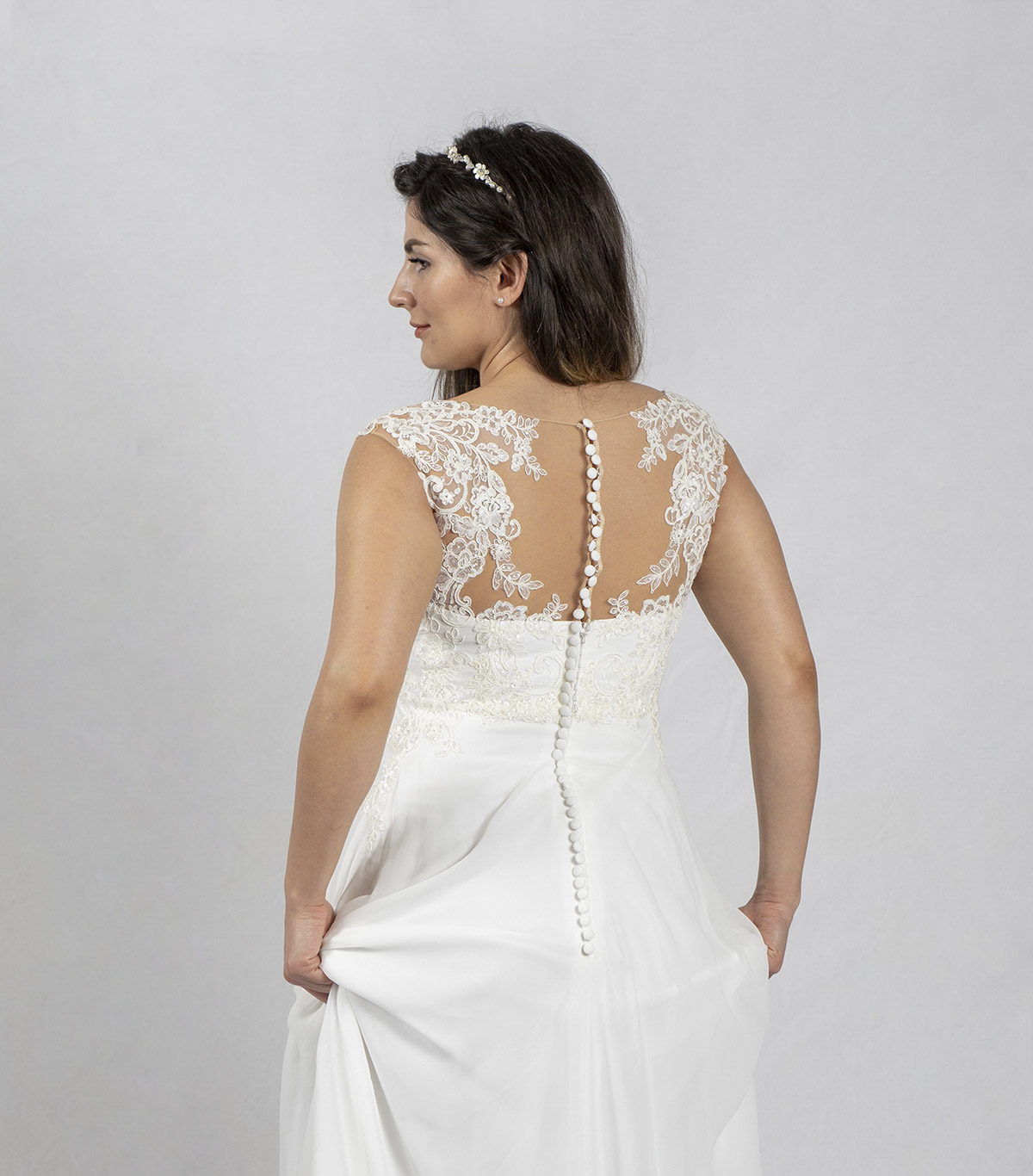 Der Rückenteil wurde aus Tattoo Spitze gefertigt und ist ein echter Hingucker. Der Rock aus Chiffon fällt schmeichelhaft über Ihren Babybauch und verhüllt ihn gleichzeitig schützend. Die edle Schleppe komplettiert dieses Märchenkleid.