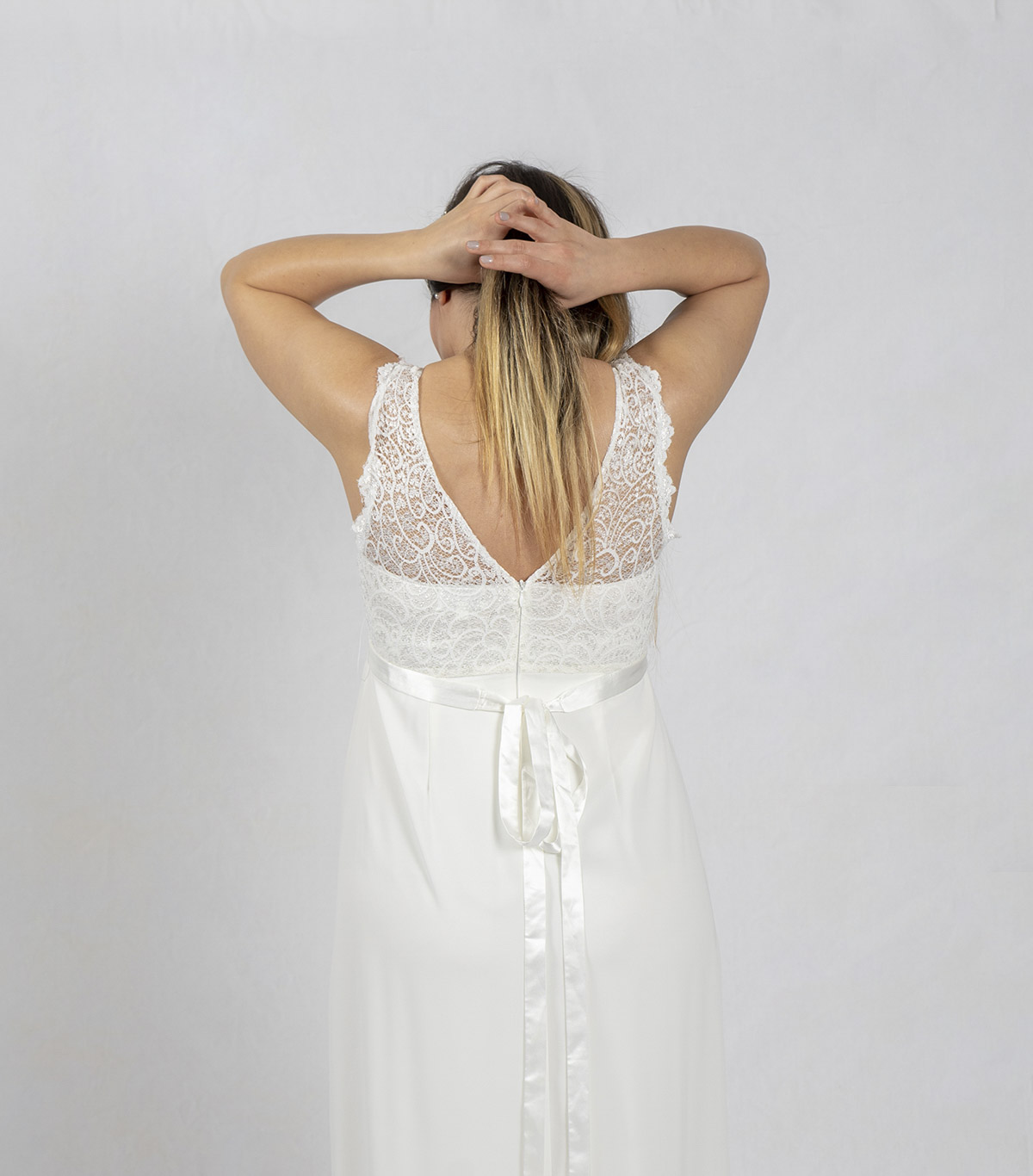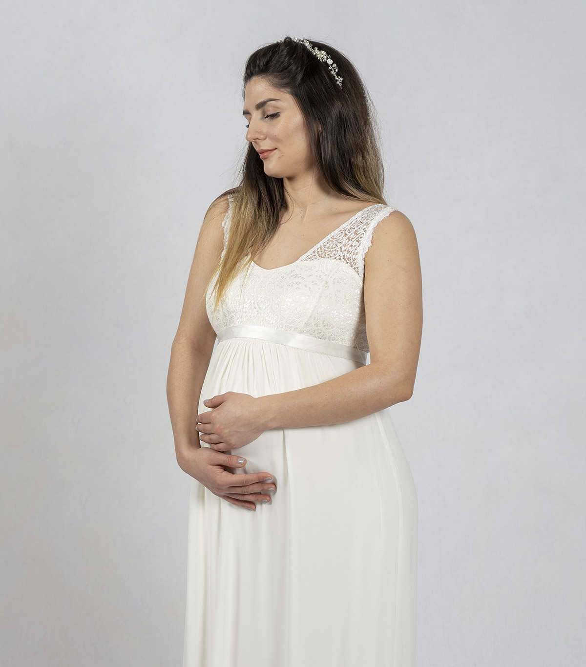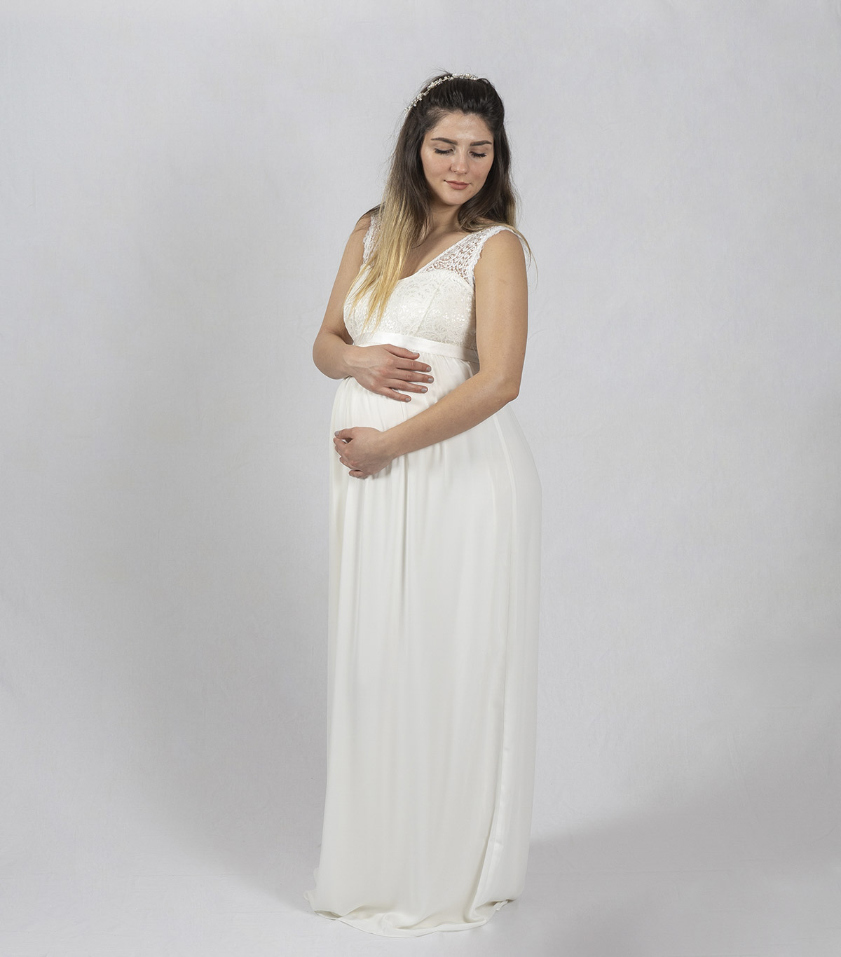 Das Spitzenoberteil mit V-Ausschnitt schmeichelt Ihrer Figur ebenso wie der lange Rock aus Chiffon. Als Highlight verfügt das Brautkleid über einen wundervollen Satingürtel zum Binden. Ihr Babybauch kann nicht schöner in Szene gesetzt werden.