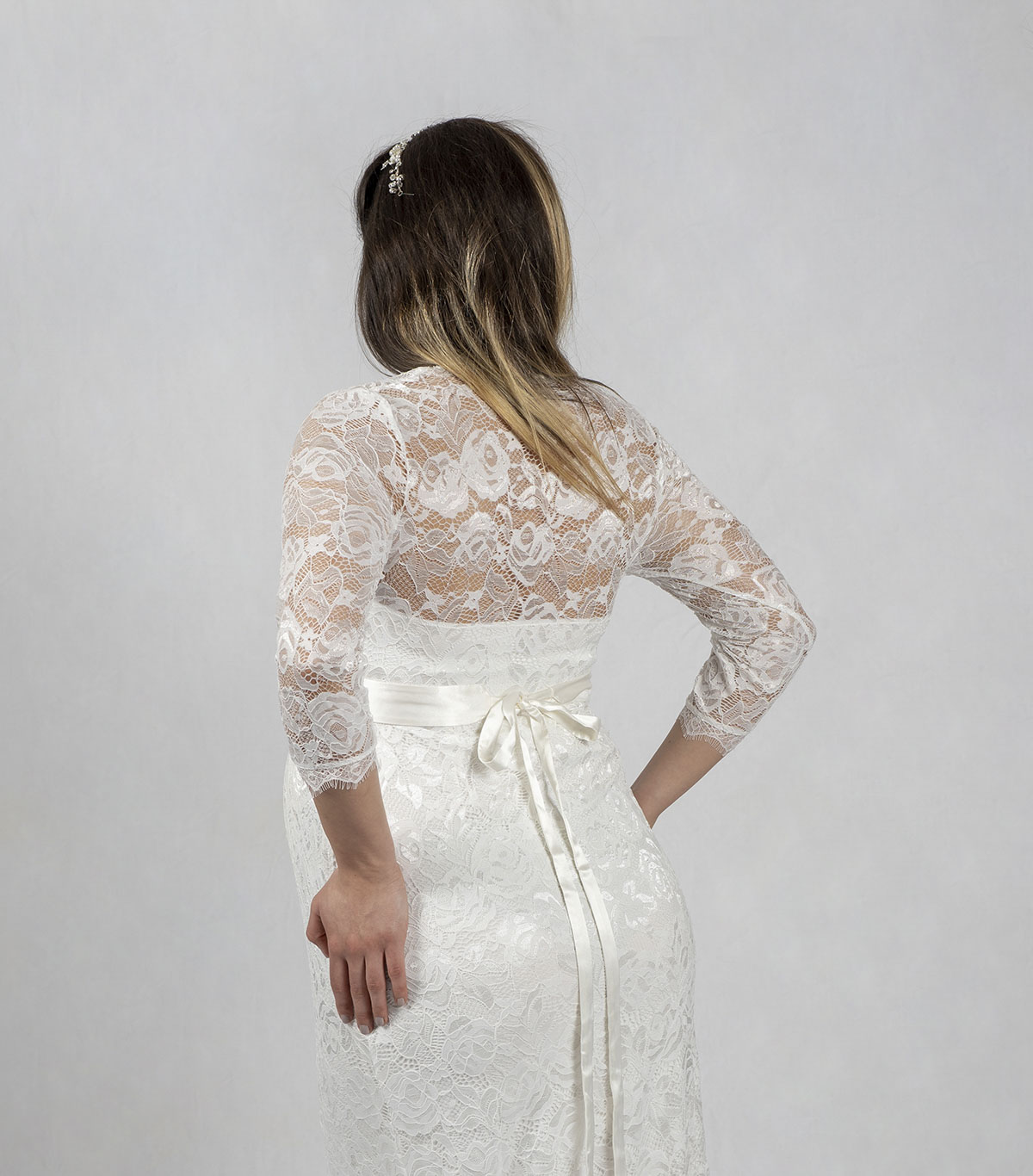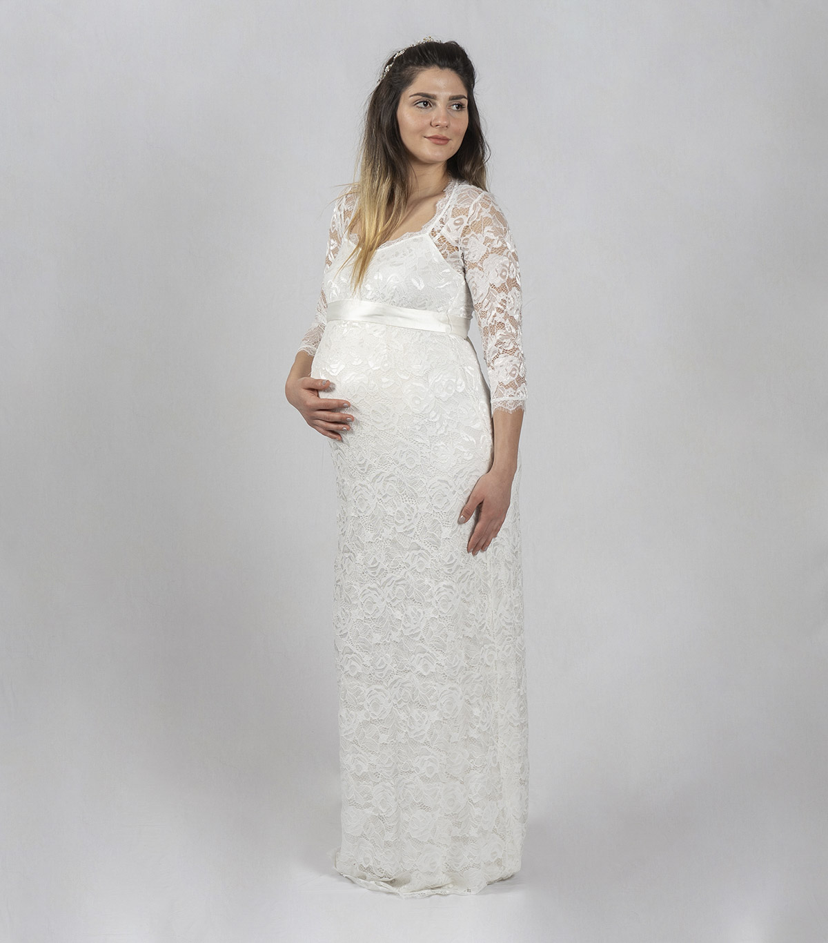 Es ist ein Spitzenkleid mit einem hochwertigen Satingürtel und aufwendig gearbeiteten 3/4 Ärmeln. Dieses Kleid schmeichelt Ihrem Babybauch auf ganz zauberhafte Weise. Sie werden sich am schönsten Tag Ihres Lebens wie eine Prinzessin fühlen.